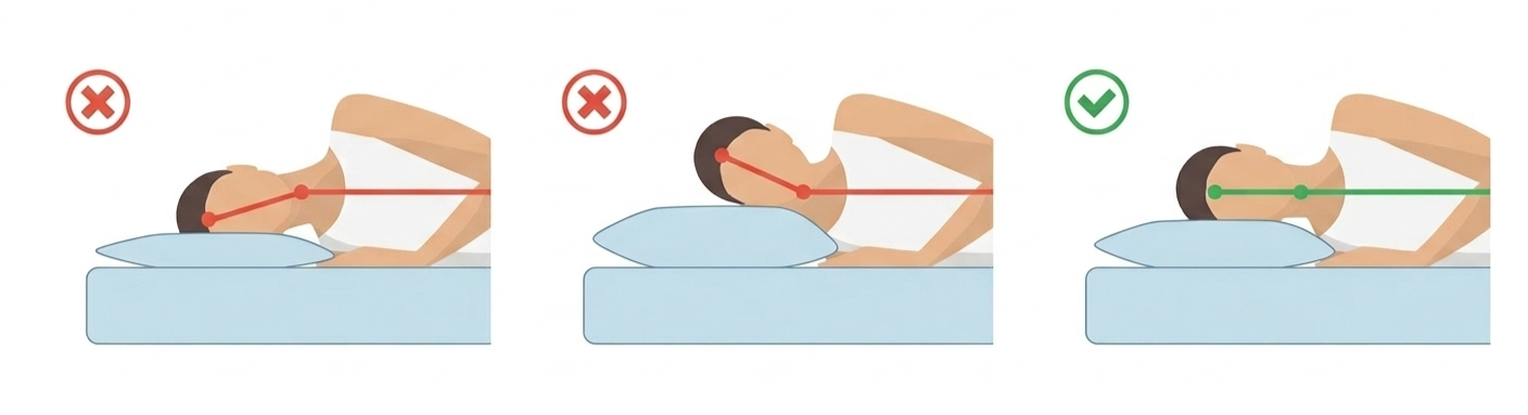 In Seitenlage führt ein zu weiches oder zu flaches Kissen dazu, dass der Kopf seitlich absinkt. Dadurch geraten die kurzen Nackenmuskeln am Schädelansatz unter Dauerzug. Ein Kissen mit ausreichender Masse oder Rückstellkraft stabilisiert den Kopf in einer neutralen Achse und verhindert diese schmerzhafte Überdehnung der myofaszialen Strukturen.